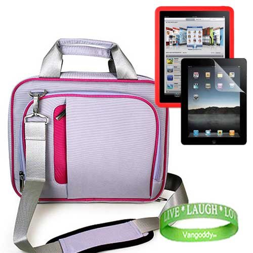 Apple iPad Accessories kit for travel and protection Includes: ** PURPLE - HOT PINK TRIM ** Apple iPad Messenger Bag Carrying Case + ** RED ** Apple iPad Silicone Skin + Apple iPad Screen Protector + Live * Laugh * Love Wrist Band!!!Product Description